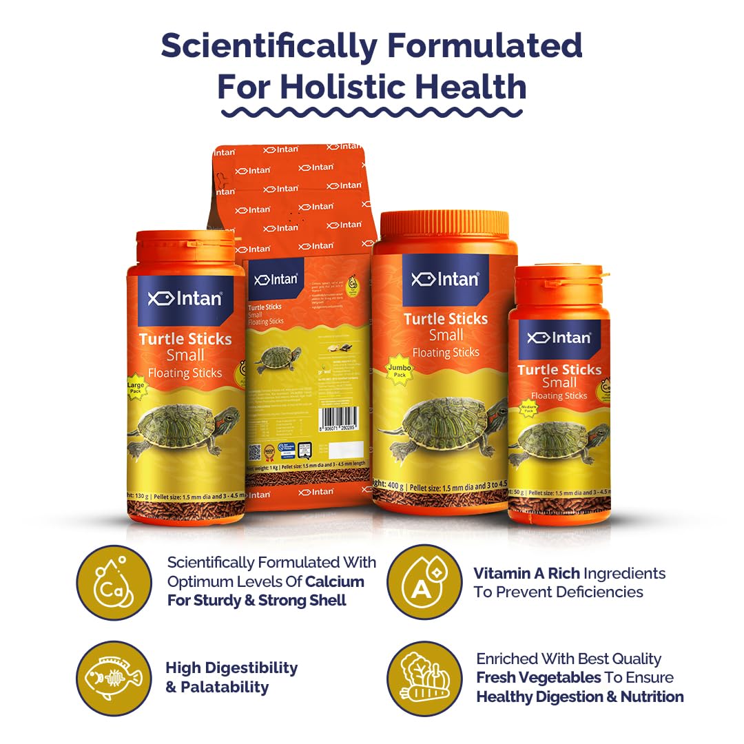 Give your turtles the nourishment they deserve with Aquatic Intan Turtle Food, specifically formulated to promote health, growth, and shell strength. Designed to meet the dietary needs of aquatic turtles, this nutritious feed ensures their overall vitality while maintaining a balanced, healthy lifestyle. Our turtle food comes in a convenient Jumbo 400 gm Pack to last longer and deliver excellent value. With a stick size of 1.5 mm diameter and 3 to 4.5 mm length, these small floating sticks are perfectly suited for turtles of all ages and sizes. Whether you are caring for hatchlings or adult turtles, Aquatic Intan Turtle Food ensures easy consumption and digestion.