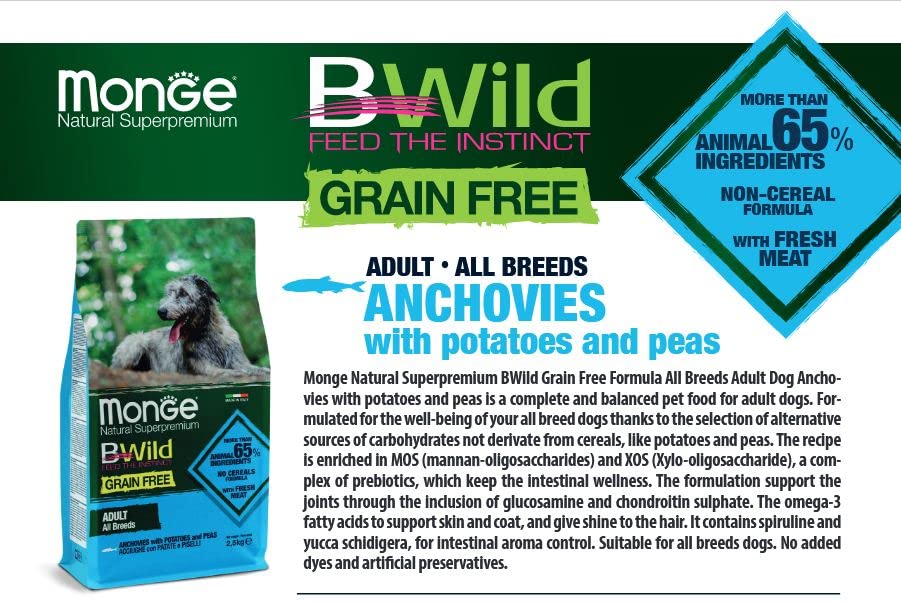 - Monge Natural SuperPremium Grain Free Formula All Breeds Adult Dog Salmon with Peas is a complete and balanced pet food for adult dogs