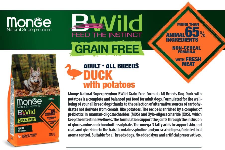 - Monge Natural SuperPremium Grain Free Formula All Breeds Dog Duck with Potatoes is a complete and balanced pet food for adult dogs.