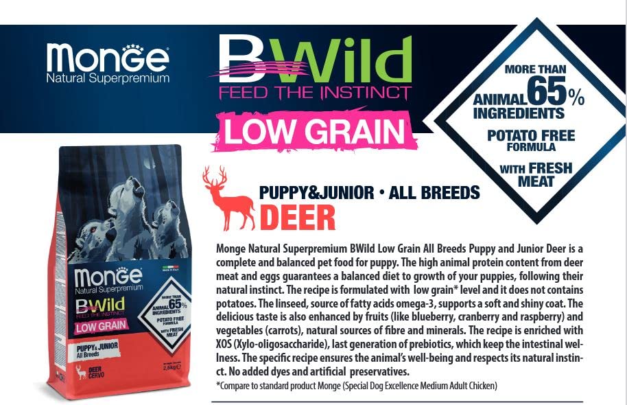 - Monge B-Wild Low Grain All Breeds Puppy & Junior Deer is a complete and balanced food for puppy. The high animal protein content from deer meat and eggs guarantees a balanced diet to growth of your puppies, following their natural instinct.