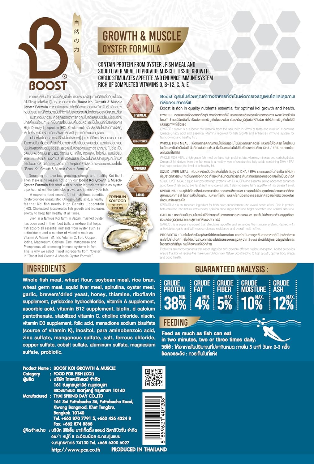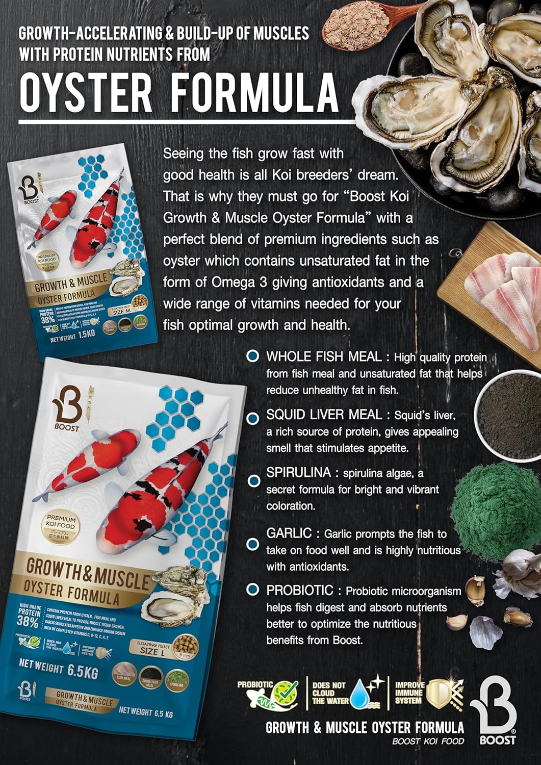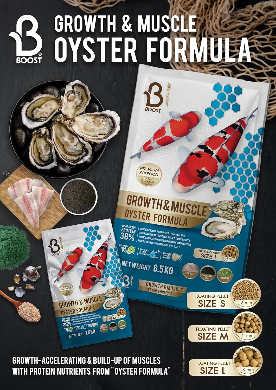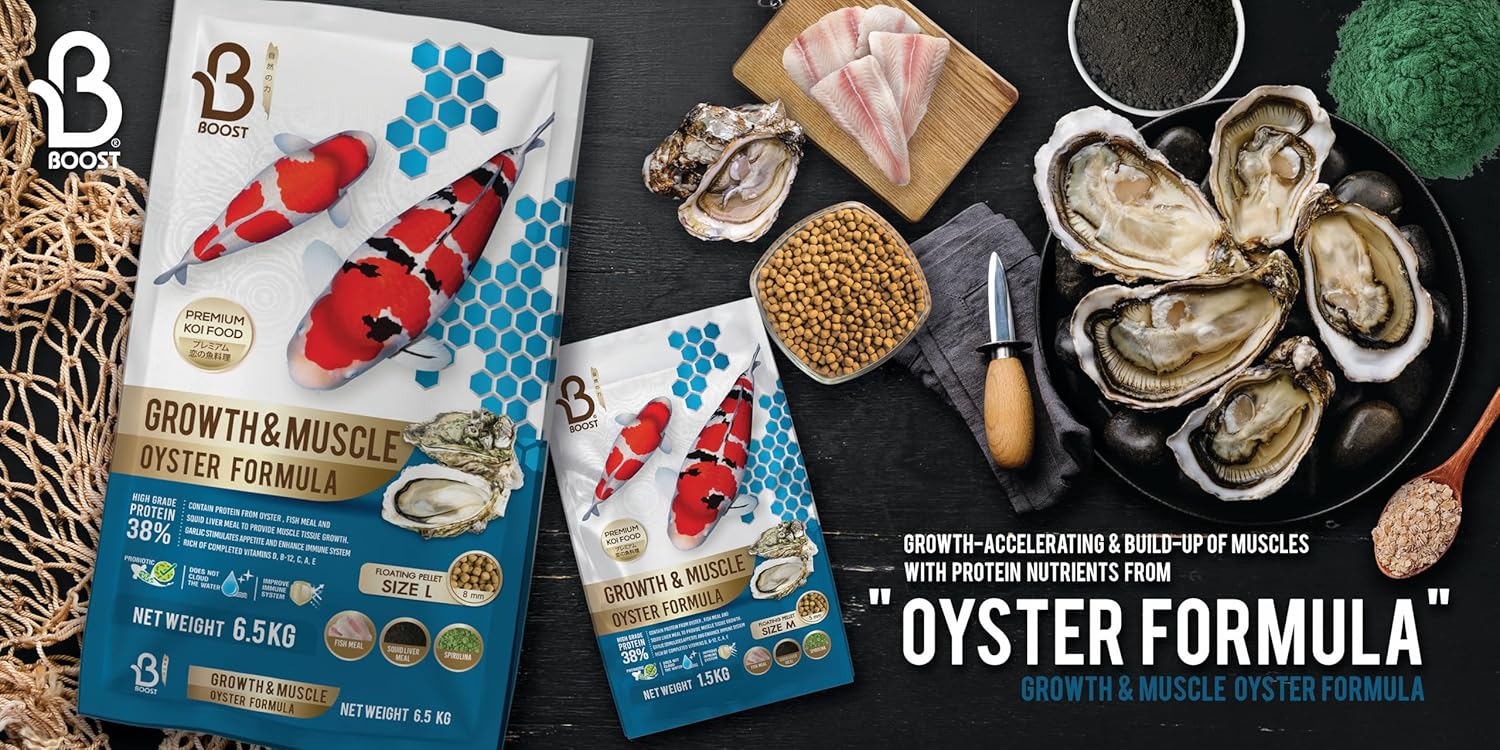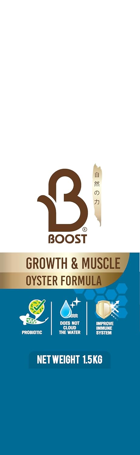 Boost Super Premium Koi Fish Food with Squid Liver Meal, for Growth & Muscle Oyster Formula Large 8mm Pellet 1.5kg