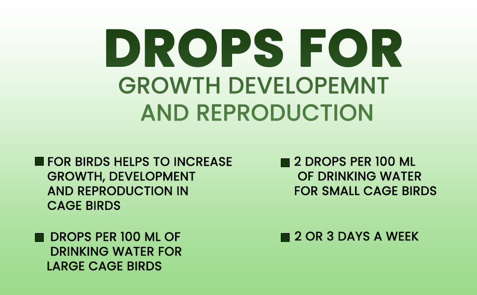 2 drops per 100 ml of drinking water for small cage birds. 3 drops per 100 ml of drinking water for large cage birds. 2 or 3 days a week.