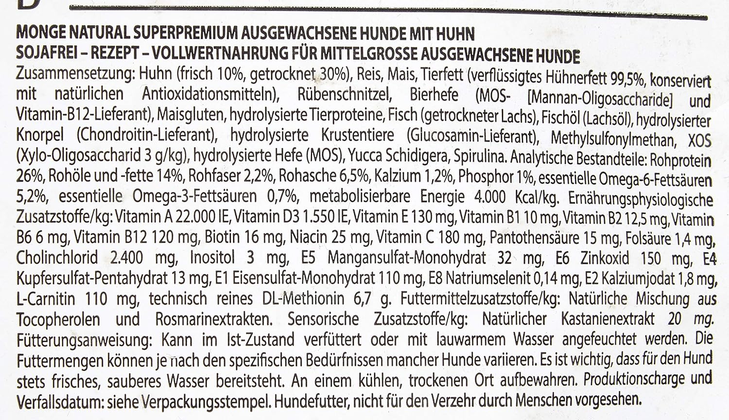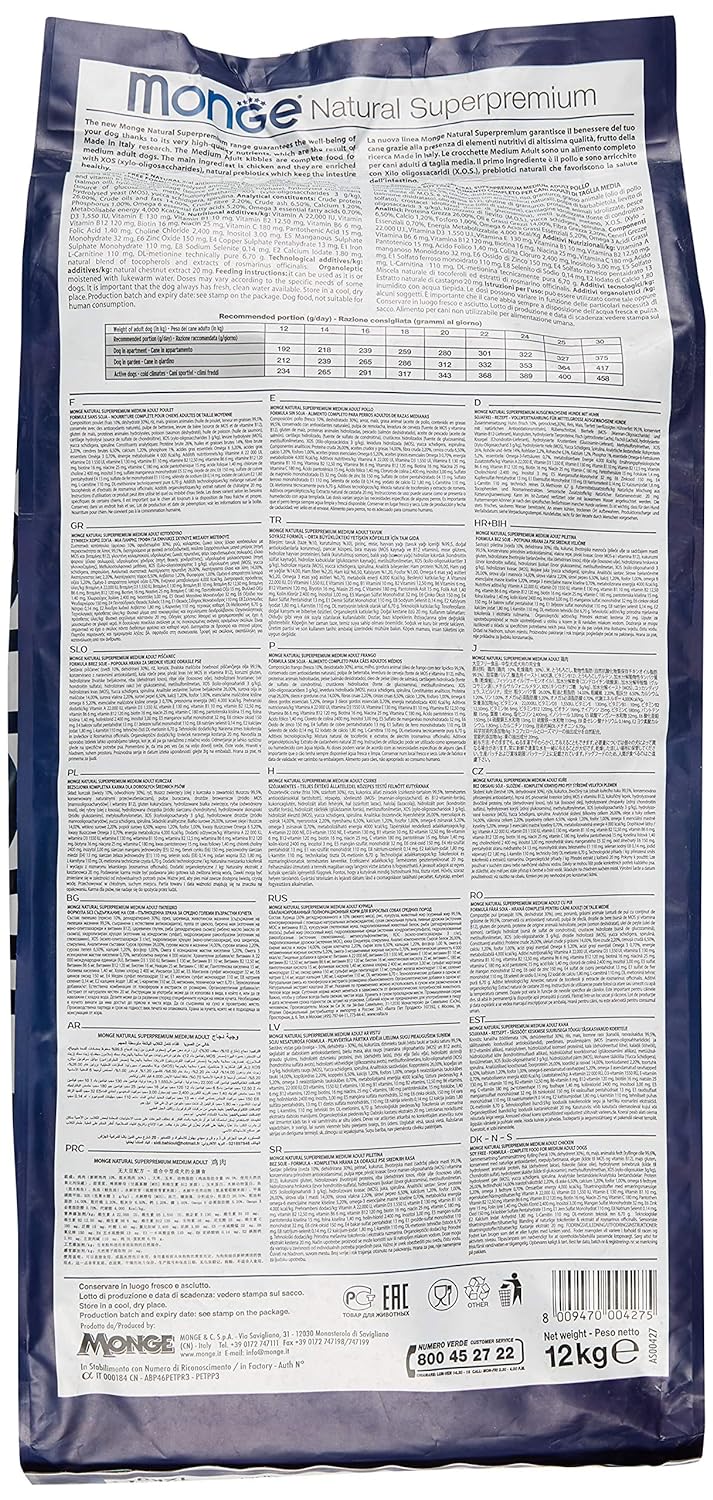 Kibbles Monge Natural Superpremium Medium Adult with Chicken are a complete food for dogs of medium size. They guarantee the well-being of your dog thanks to their very high-quality nutrients, which are the result of Made in Italy research. The main ingredient is chicken and they are enriched with XOS (xylo-oligosaccharides), natural prebiotics which keep the intestine healthy. L-carnitine preserve heart and ensure an optimal weight and they are rich in Omega 3/6 for healthy skin and coat.