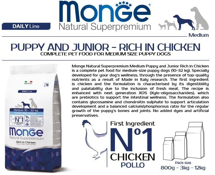 - Kibbles Monge Natural Superpremium Medium Puppy & Junior with Chicken are a complete food for puppies of medium size. They guarantee the well-being of your dog thanks to their very high-quality nutrients, which are the result of Made in Italy research